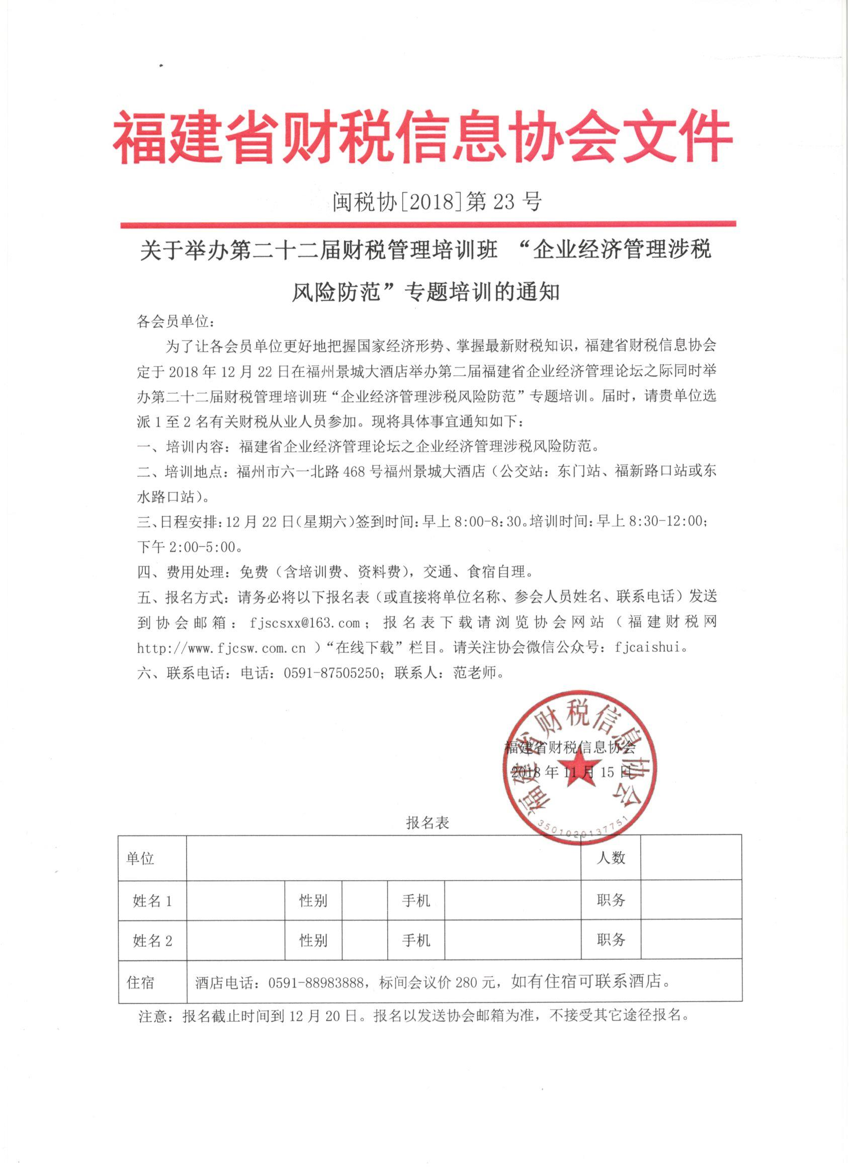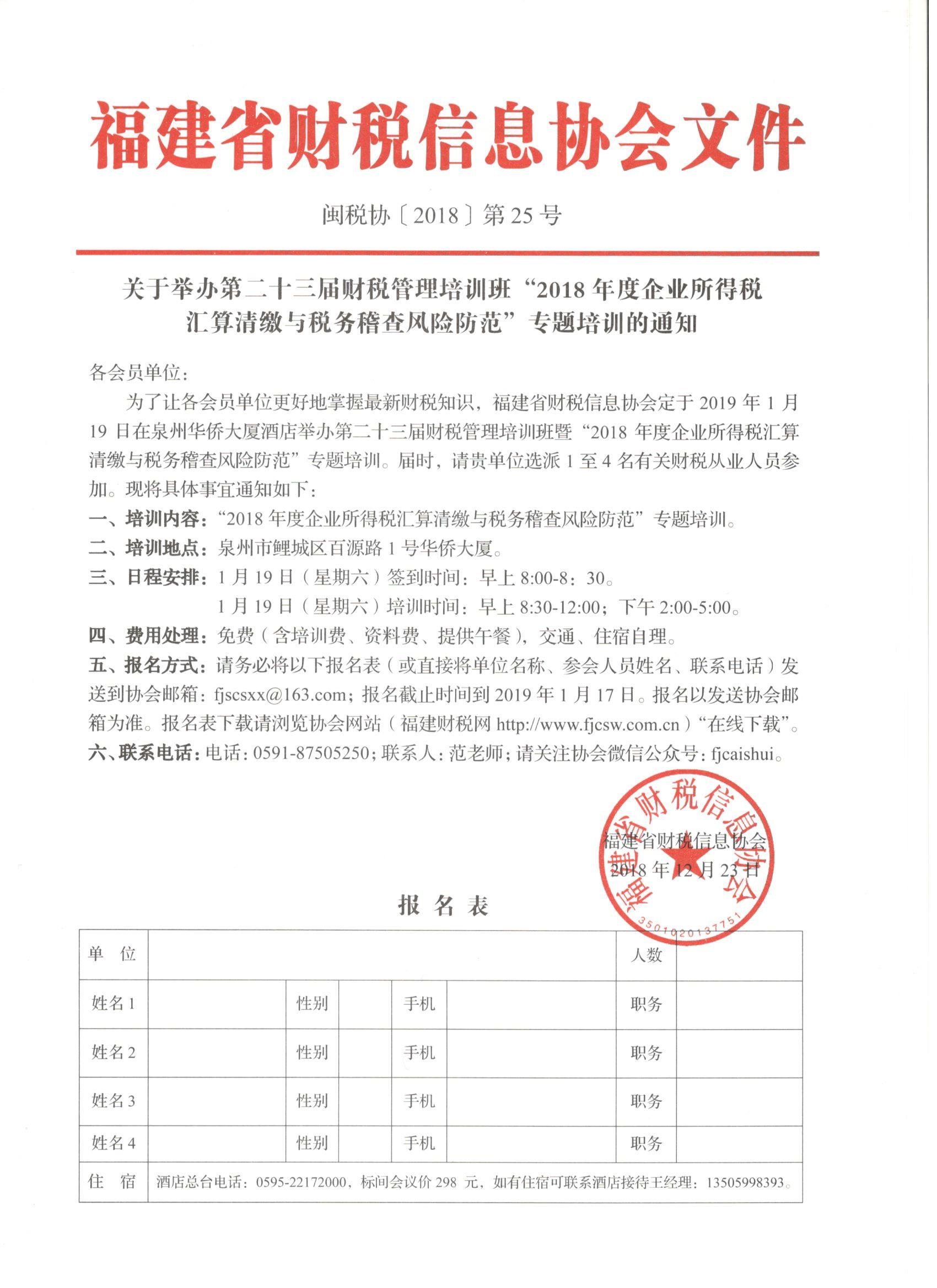 關(guān)于舉辦第二十三屆財稅管理培訓(xùn)班 “2018年度企業(yè)所得稅匯算清繳與稅務(wù)稽查風(fēng)險防范”專題培訓(xùn)的通知
