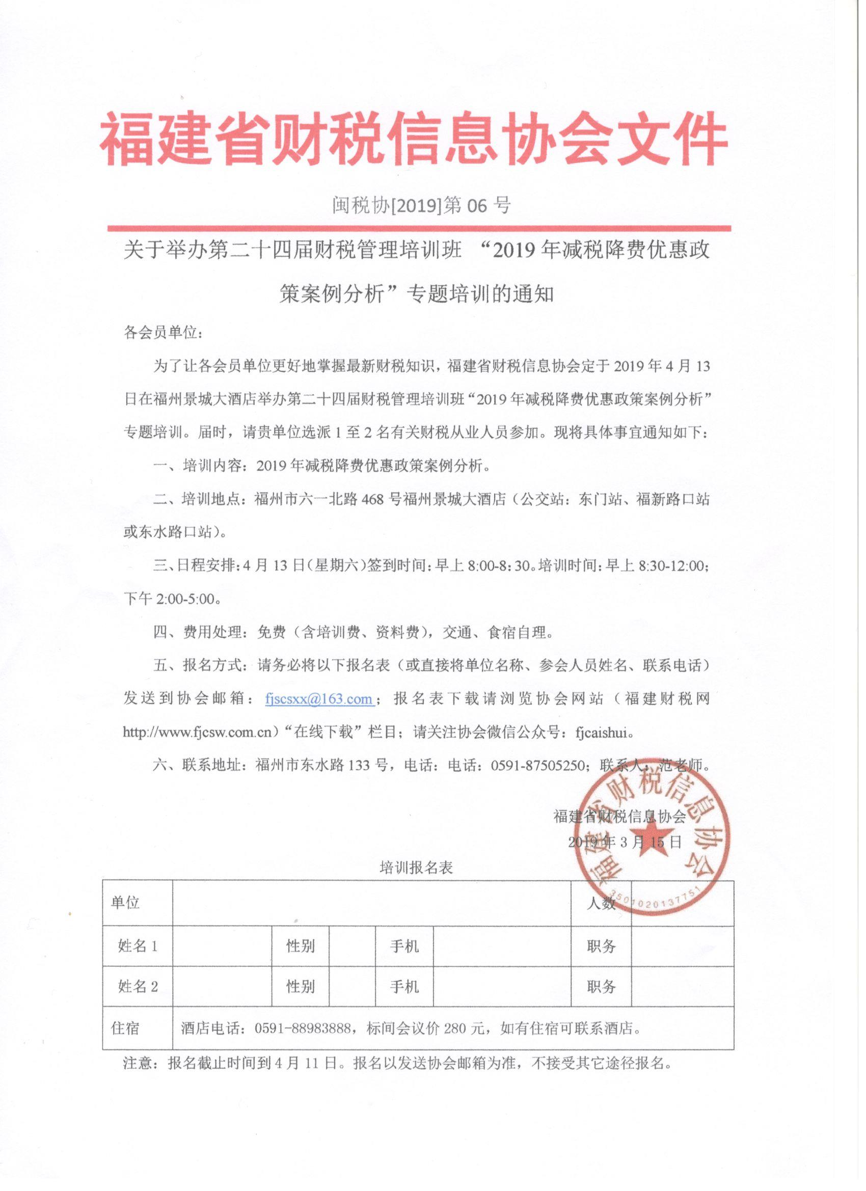 關(guān)于舉辦第二十四屆財稅管理培訓(xùn)班 “2019年減稅降費優(yōu)惠政策案例分析”專題培訓(xùn)的通知