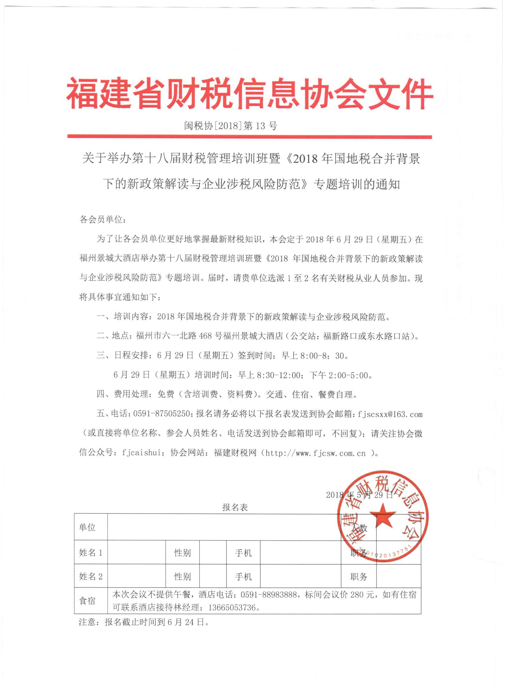 關(guān)于舉辦第二十屆財稅管理培訓班“企業(yè)財務管理問題和實務操作技巧暨個人所得稅改革重點及金稅三期下個人所得稽查風險防范”專題培訓的通知
