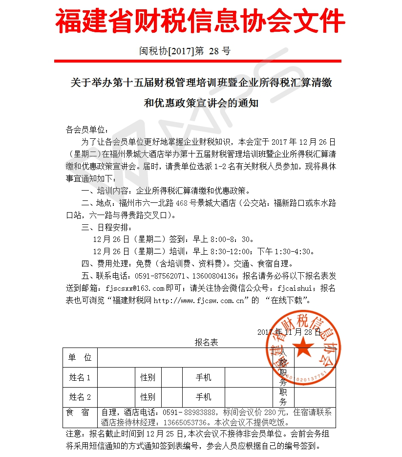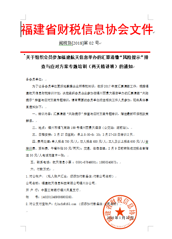 關于組織會員參加福建航天信息舉辦的匯算清繳“風險提示”排查與應對方案專題培訓(兩天精講班)的通知