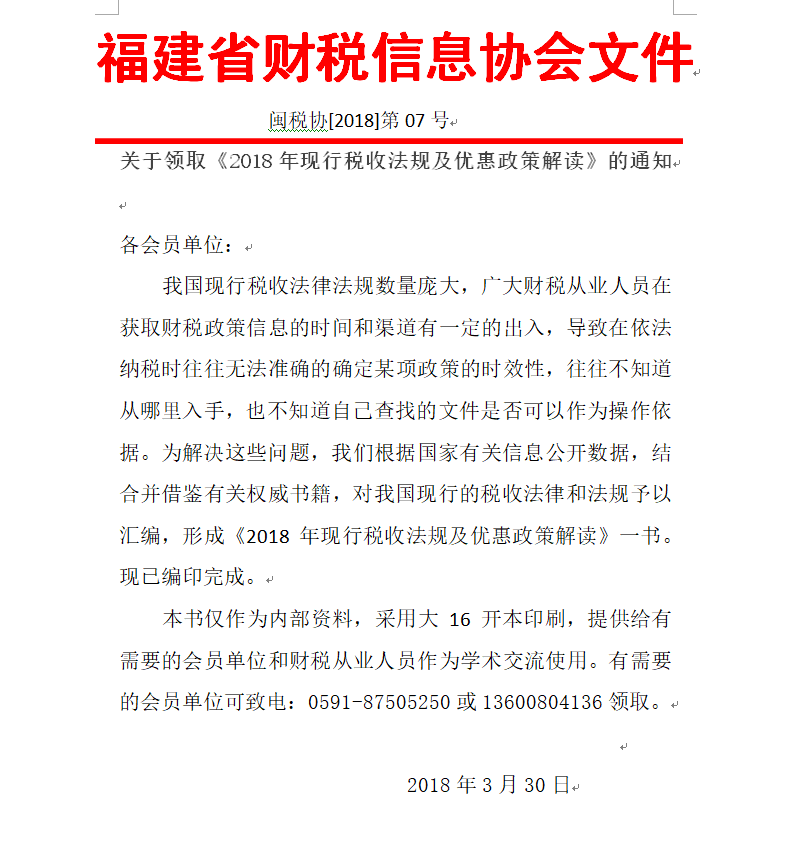 關于領取《2018年現(xiàn)行稅收法規(guī)及優(yōu)惠政策解讀》的通知