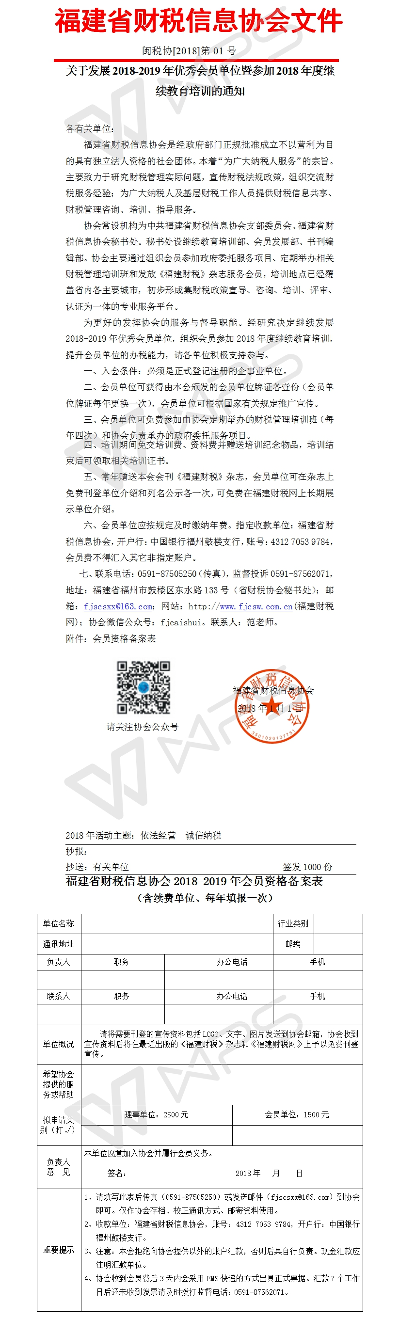 為更好的發(fā)揮協(xié)會的服務與督導職能。經(jīng)研究決定繼續(xù)發(fā)展2018-2019年優(yōu)秀會員單位,組織會員參加2018年度繼續(xù)教育培訓,提升會員單位的辦稅能力,請各單位積極支持參與。