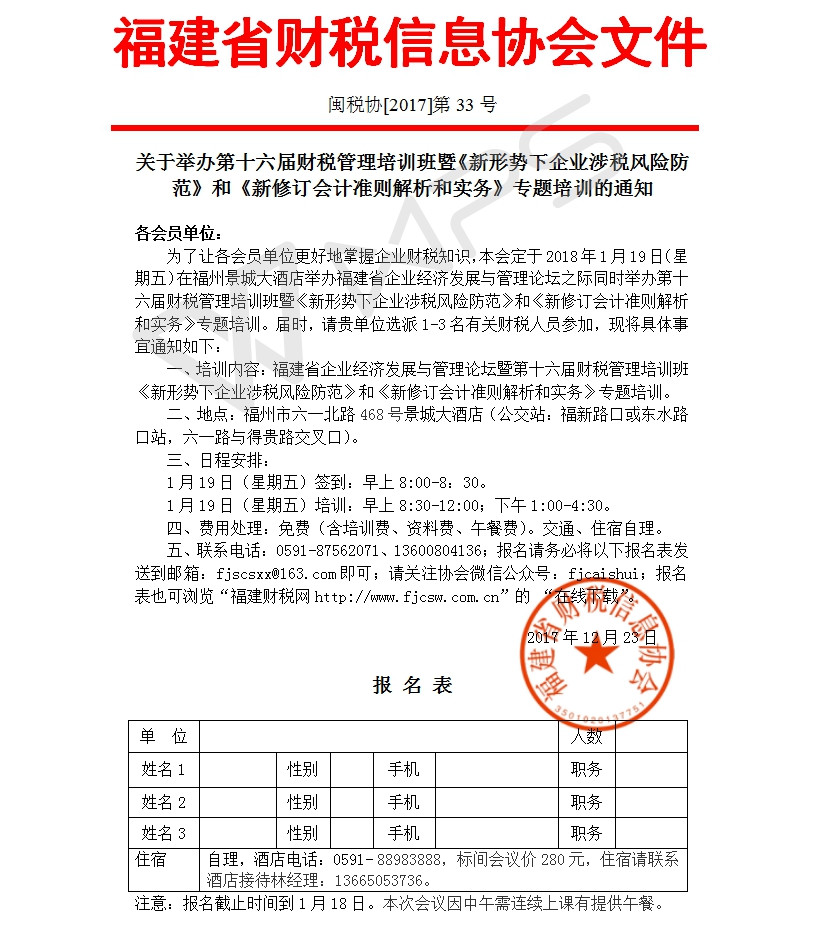 為了讓各會員單位更好地掌握企業(yè)所得稅知識,做好2017年度匯算清繳工作,根據(jù)福建航天信息財稅培訓計劃,決定組織會員企業(yè)參加在福州麗景大酒店舉辦的匯算清繳“風險提示”排查與應對方案專題培訓。