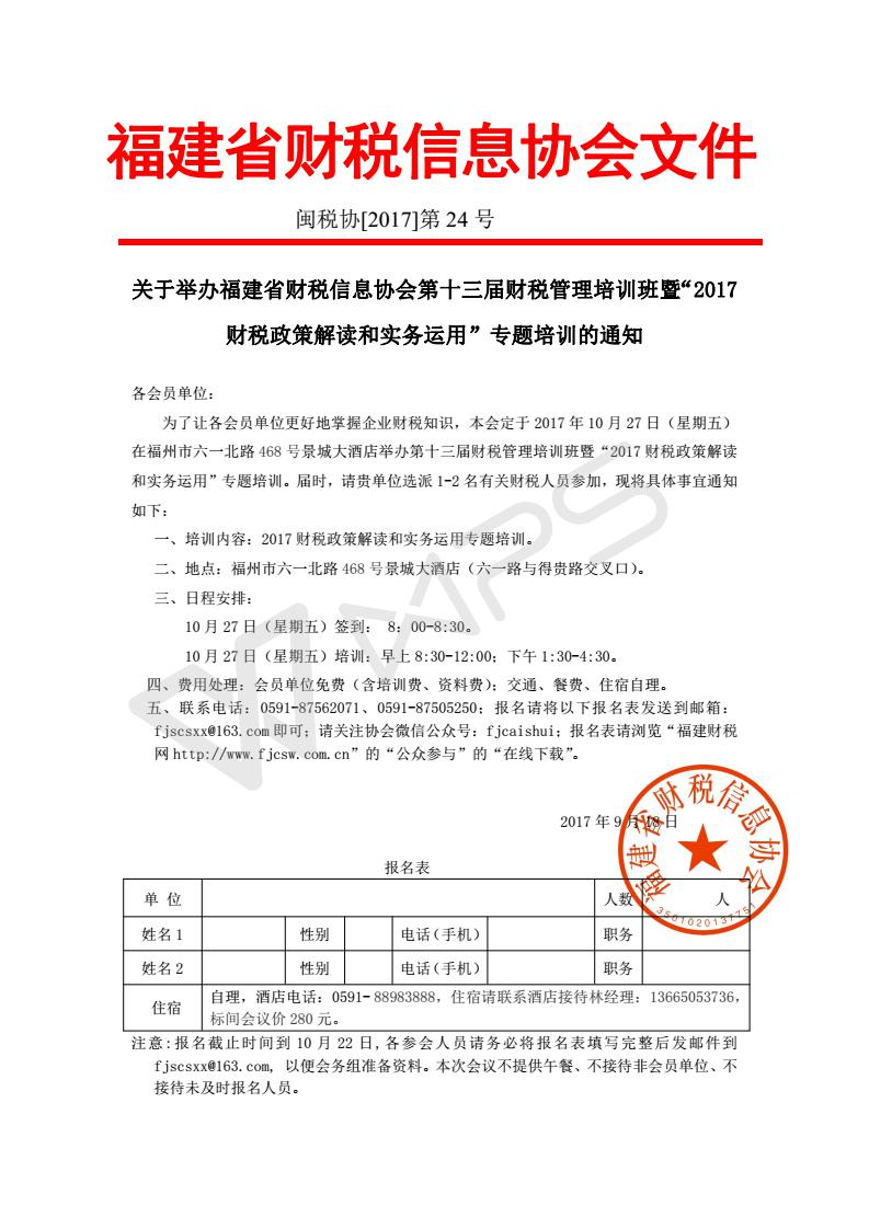 為了讓各會員單位更好地掌握企業(yè)財稅知識,本會定于2017年10月27日(星期五)在福州市六一北路468號景城大酒店舉辦第十三屆財稅管理培訓(xùn)班暨“2017財稅政策解讀和實務(wù)運用”專題培訓(xùn)。