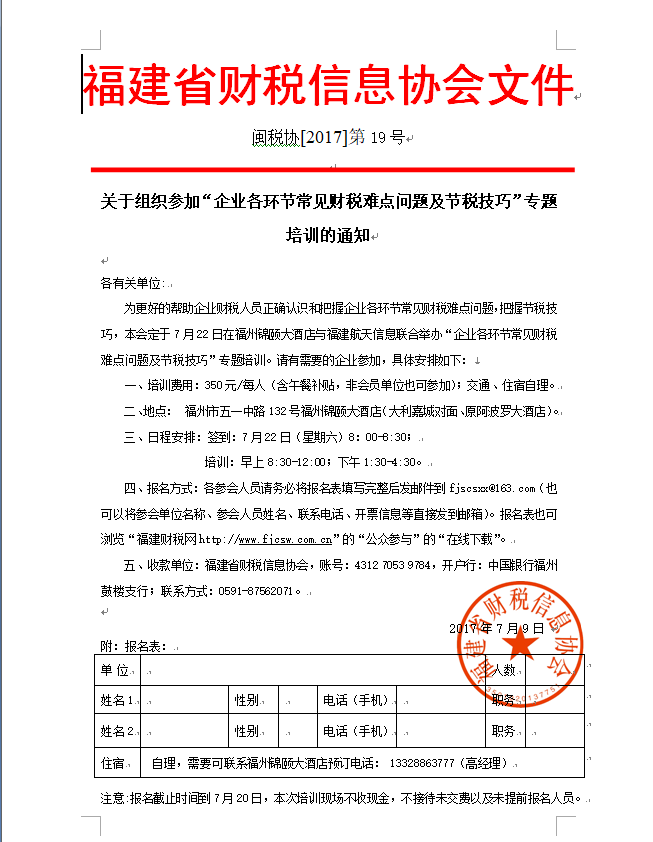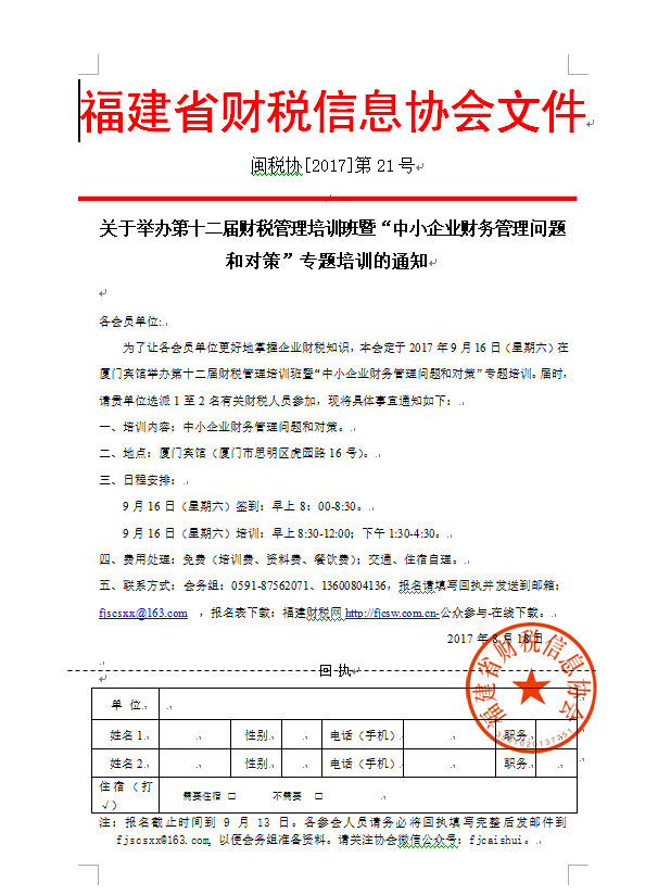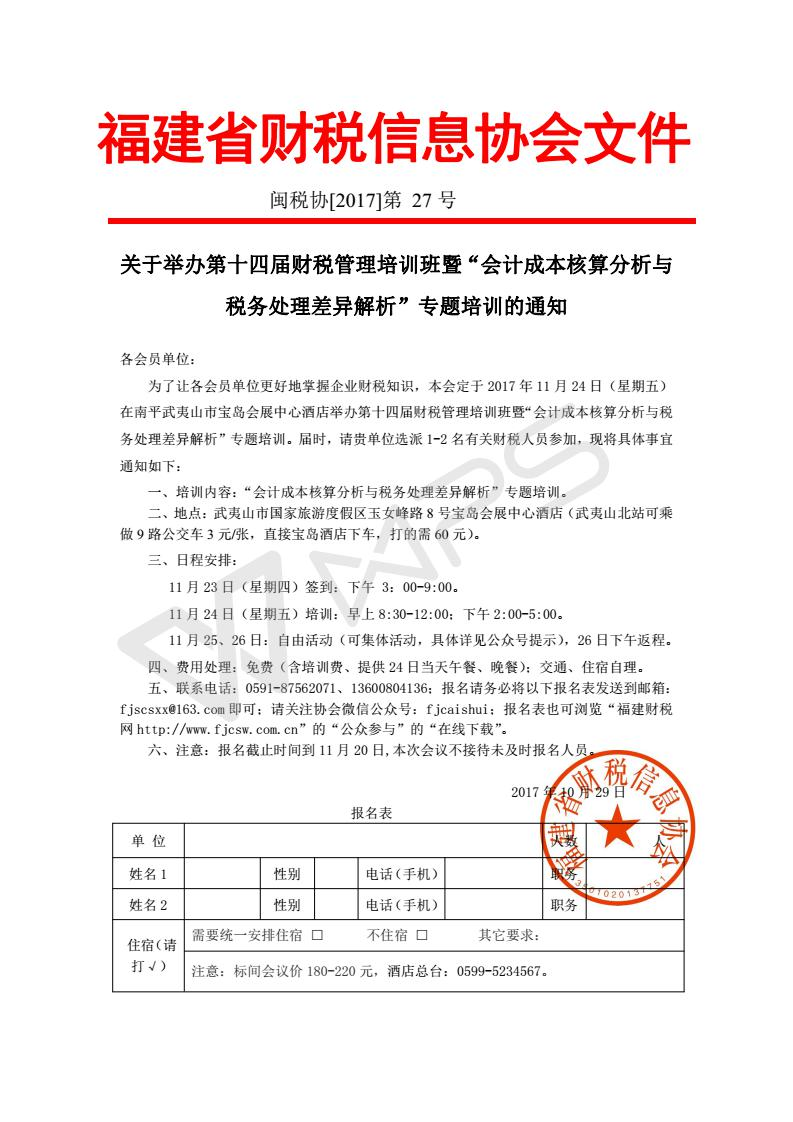 為了讓各會員單位更好地掌握企業(yè)財稅知識,本會定于2017年11月24日(星期五)在南平武夷山市寶島會展中心酒店舉辦第十四屆財稅管理培訓(xùn)班暨“會計成本核算分析與稅務(wù)處理差異解析”專題培訓(xùn)。
