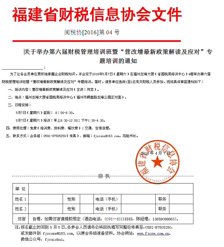為了讓各會(huì)員單位更好地掌握企業(yè)財(cái)稅知識,本會(huì)定于2016年5月7日(星期六)在福州左海大廈(省國稅局培訓(xùn)中心)4樓舉辦第六屆財(cái)稅管理培訓(xùn)班暨“營改增最新政策解讀及應(yīng)對”專題培訓(xùn)。