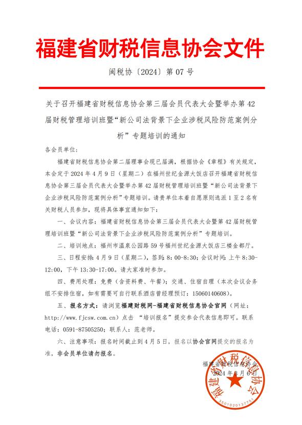 關于召開第三屆會員代表大會暨舉辦第42屆財稅管理培訓班暨“新公司法背景下企業(yè)涉稅風險防范案例分析”專題培訓的通知