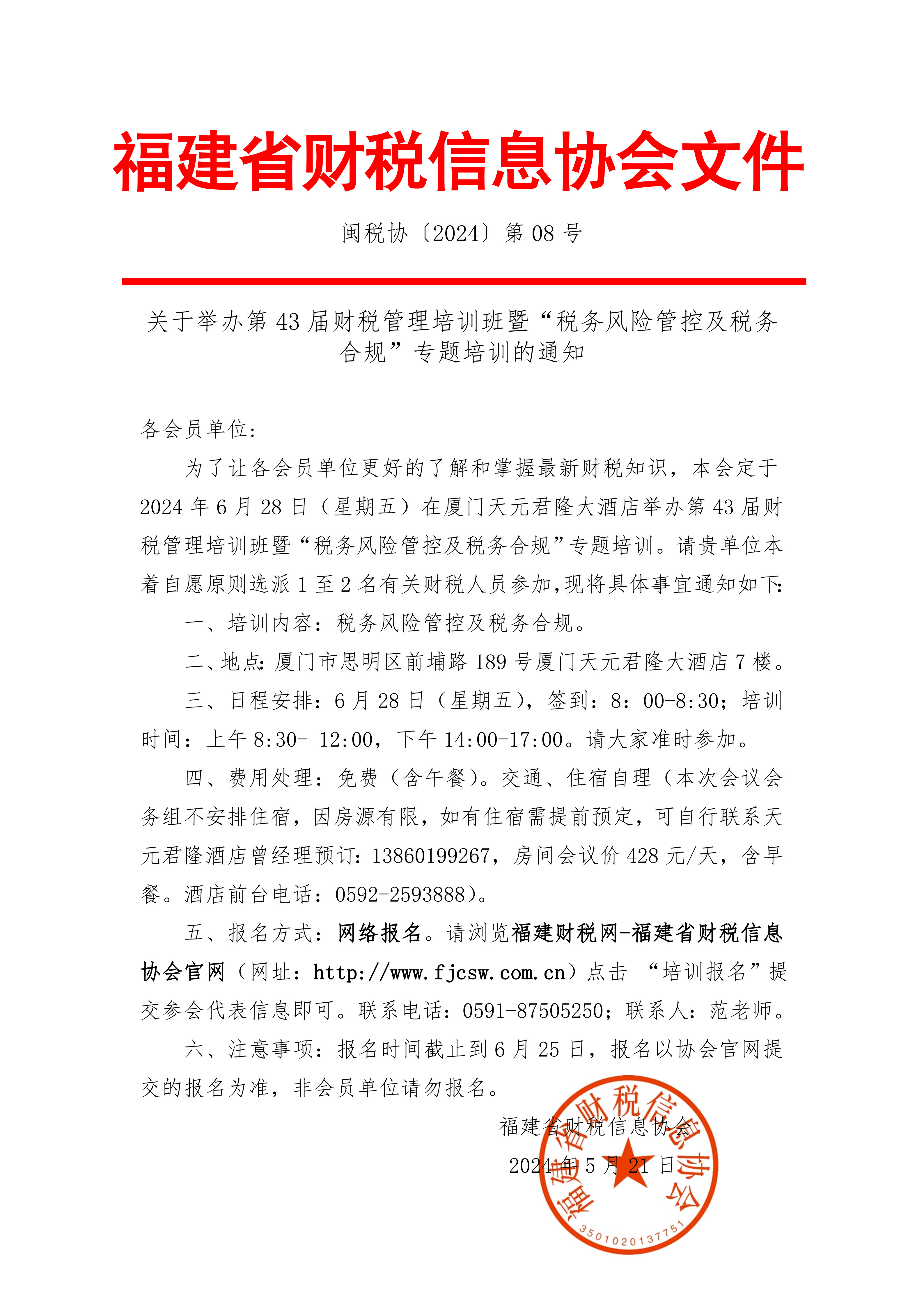 關于舉辦第43屆財稅管理培訓班暨“稅務風險管控及稅務合規(guī)”專題培訓的通知
