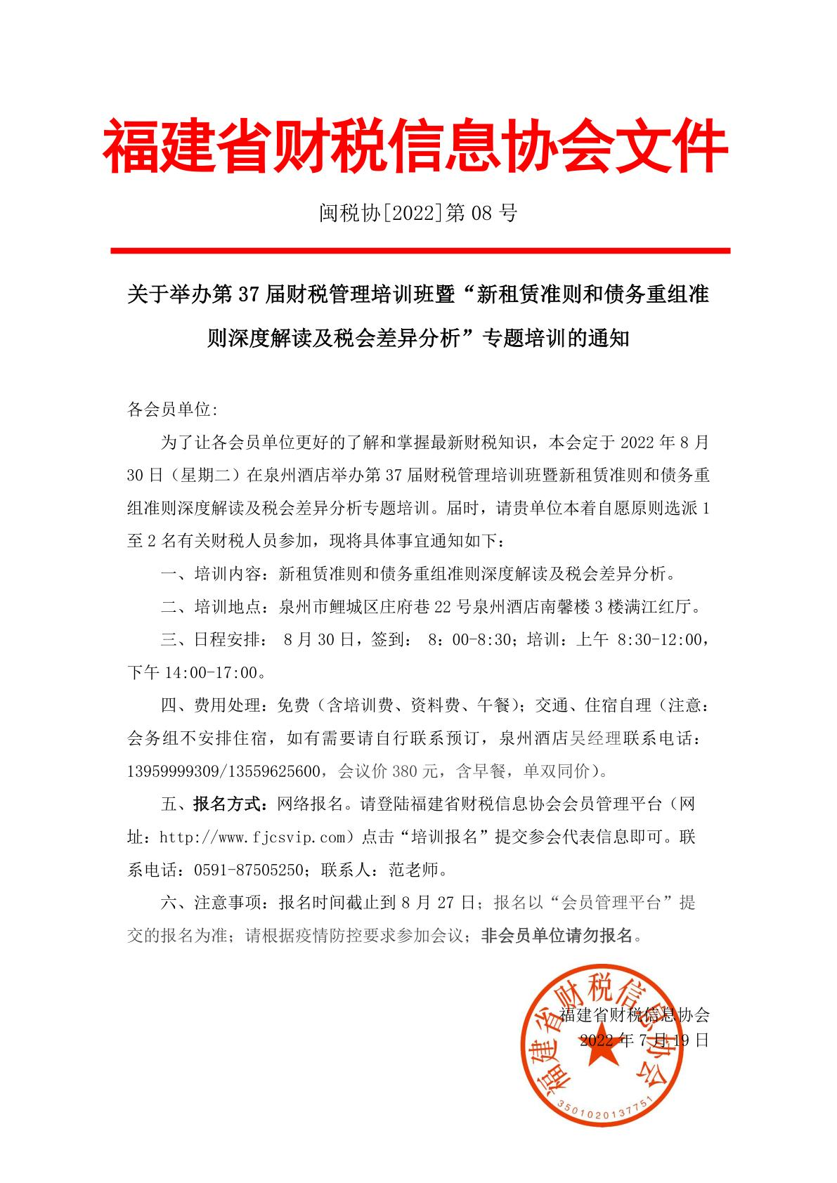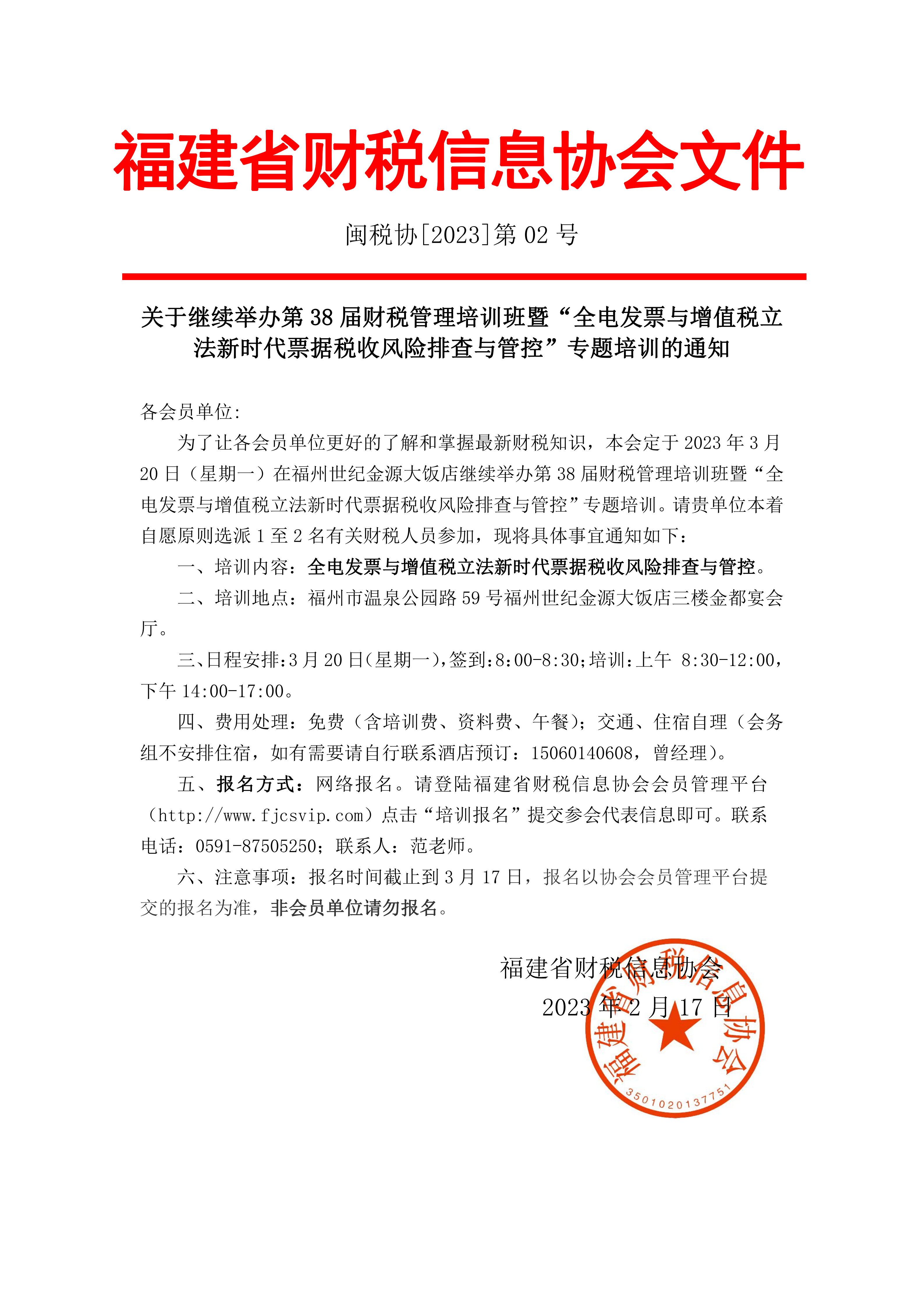 關(guān)于繼續(xù)舉辦第38屆財稅管理培訓(xùn)班暨全電發(fā)票與增值稅立法新時代票據(jù)稅收風(fēng)險排查與管控專題培訓(xùn)的通知