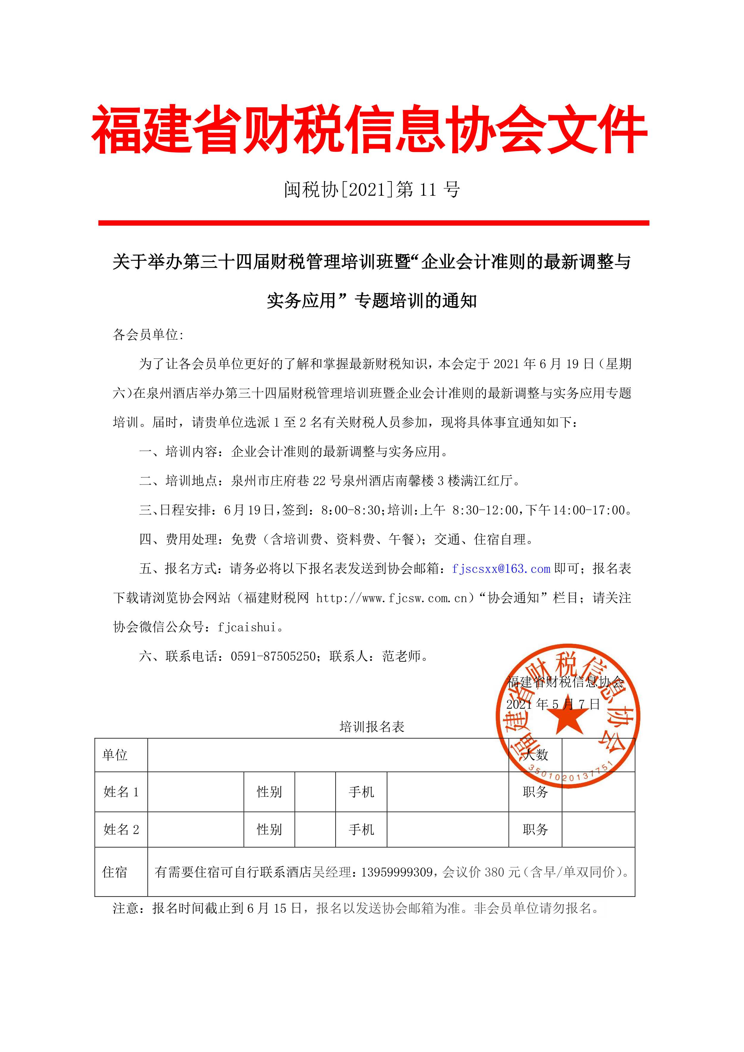 為了讓各會(huì)員單位更好的了解和掌握最新財(cái)稅知識(shí),本會(huì)定于2021年6月19日(星期六)在泉州酒店舉辦第三十四屆財(cái)稅管理培訓(xùn)班暨企業(yè)會(huì)計(jì)準(zhǔn)則的最新調(diào)整與實(shí)務(wù)應(yīng)用專題培訓(xùn)。
