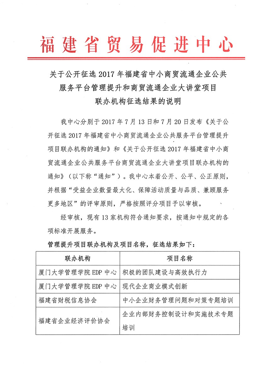 經(jīng)福建省貿(mào)易促進(jìn)中心公開征選2017年福建省中小商貿(mào)流通企業(yè)公共服務(wù)平臺管理提升和商貿(mào)流通企業(yè)大講堂項目聯(lián)辦機(jī)構(gòu),福建省財稅信息協(xié)會成功獲2017年福建省中小商貿(mào)流通企業(yè)公共服務(wù)平臺管理提升和商貿(mào)流通企業(yè)大講堂項目聯(lián)辦機(jī)構(gòu)。