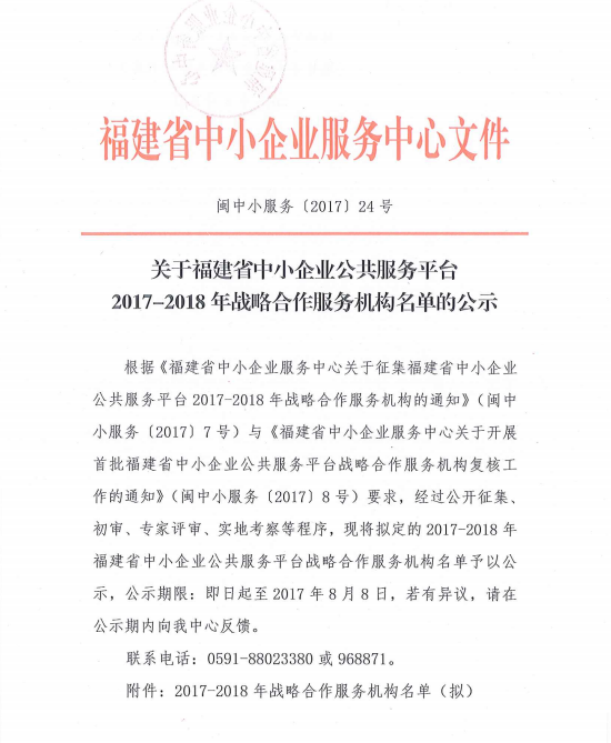 根據(jù)《福建省中小企業(yè)服務(wù)中心關(guān)于征集福建省中小企業(yè)公共服務(wù)平臺2017-2018年戰(zhàn)略合作服務(wù)機(jī)構(gòu)的通知》(閩中小服務(wù)〔2017〕7號)與《福建省中小企業(yè)服務(wù)中心關(guān)于開展首批福建省中小企業(yè)公共服務(wù)平臺戰(zhàn)略合作服務(wù)機(jī)構(gòu)復(fù)核工作的通知》(閩中小服務(wù)〔2017〕8號)要求,經(jīng)過公開征集、初審、專家評審、實地考察等程序,福建省財稅信息協(xié)會榮獲2017-2018年福建省中小企業(yè)公共服務(wù)平臺戰(zhàn)略合作服務(wù)機(jī)構(gòu)。